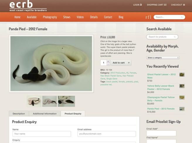 Il Panda Pied è considerato un serpente sacro. Questo in particolare è un pitone femmina, nato dopo sette anni di "ibridazioni" in allevamento. Il proprietario, Colin Weaver , che vive in Virginia, lo ha messo in vendita sul web per ben 12mila euro. Il Panda Pied è una specie pregiata e spettacolare, la sua dieta è esclusivamente composta di ratti, che strangola col il suo corpo affusolato.