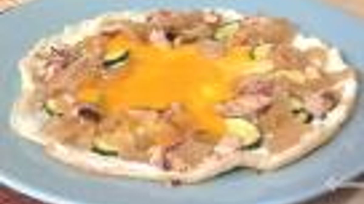 Prendiamo 3 uova biologiche e separiamo i bianchi dal tuorli. Montiamo gli albumi con la frusta. Mettiamo in una padella un goccio di olio extra vergine di oliva e vi versiamo gli albumi che in pochi secondi si solidificheranno formando la base della nostra pizza. Lasciamo un vuoto al centro della padella per far spazio ai tuorli. Successivamente guarniamo come fosse una normale pizza: mettiamo delle zucchine, dello sgombro e delle cipolle in agrodolce. Aggiungiamo al centro i tuorli d'uovo. Una grattuggiata di Parmigiano e la nostra pizza è cotta e mangiata!