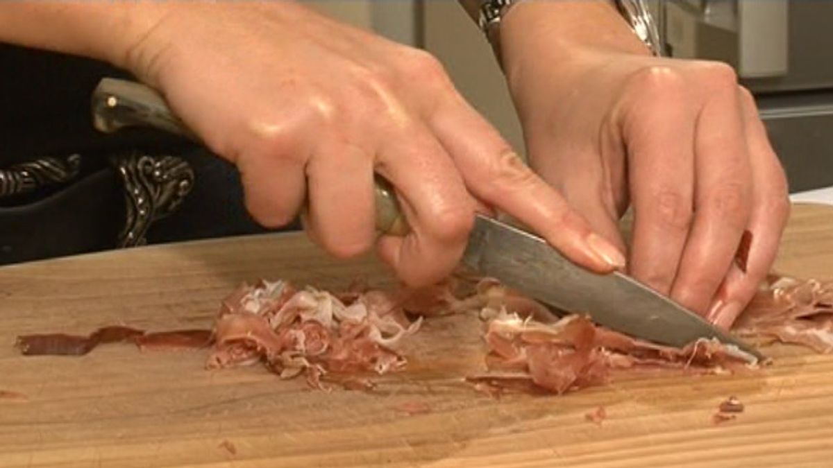 In una padella scaldate il burro insieme a 2 foglie di salvia; unite lo speck e rosolate fino a renderlo croccante.