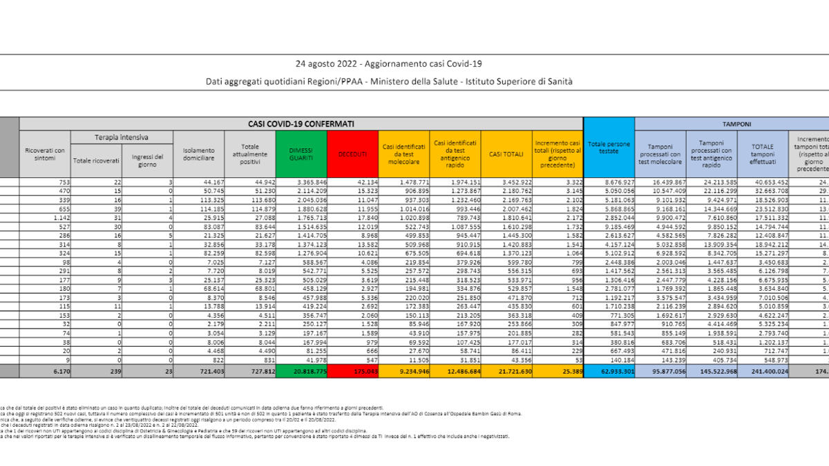 In Italia ci sono 23.438 nuovi casi di coronavirus a fronte di 154.143 tamponi effettuati (mentre il giorno prima l'incremento era stato di 25.389 con 174.227 test). Nelle ultime 24 ore sono stati registrati altri 84 decessi (contro i 112 di mercoledì) per un totale, da inizio pandemia, che arriva a 175.127. Diminuiscono gli ingressi in terapia intensiva (-5) e i ricoveri nei reparti Covid (-166). Tasso di positività al 15,2% (in leggero rialzo rispetto al 14,6% del giorno prima). Oms: "Raggiunto un milione di morti nel mondo da gennaio".