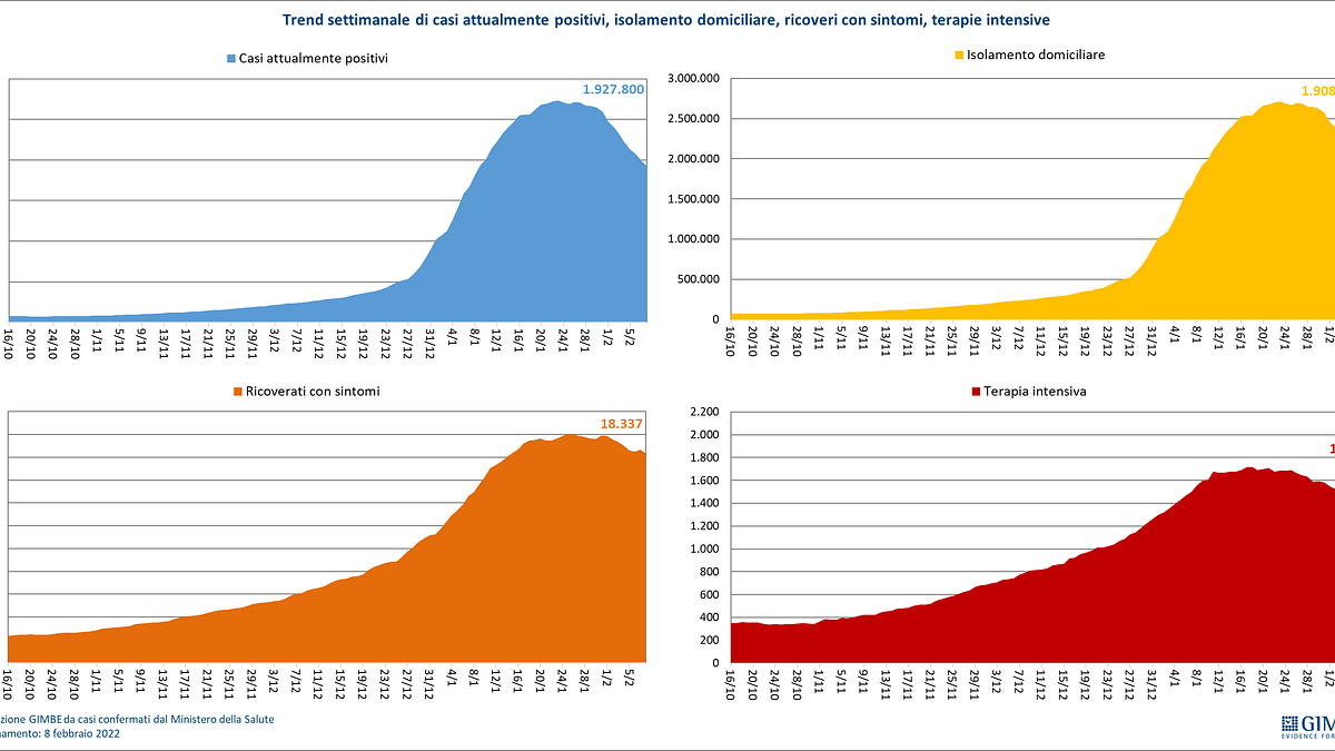 Nella settimana 2-8 febbraio, il consueto monitoraggio della fondazione Gimbe rileva una riduzione dei nuovi casi (-250mila), in parte per la minore circolazione del virus ma anche a causa della riduzione dei tamponi. In 70 province l’incidenza resta comunque superiore ai 1.000 casi per 100.000 abitanti, ma scendono i ricoveri in terapia intensiva (-173) e in area medica (-1.536). L’85,4% della popolazione ha ricevuto almeno una dose di vaccino e l’82% ha completato il ciclo vaccinale: restano 7,1 milioni di persone che non hanno ricevuto nemmeno una dose di vaccino, di cui 1,8 milioni guarite da meno di 180 giorni e 5,3 milioni vaccinabili. E crollano i nuovi vaccinati nella fascia over 50.