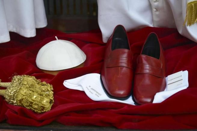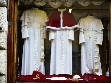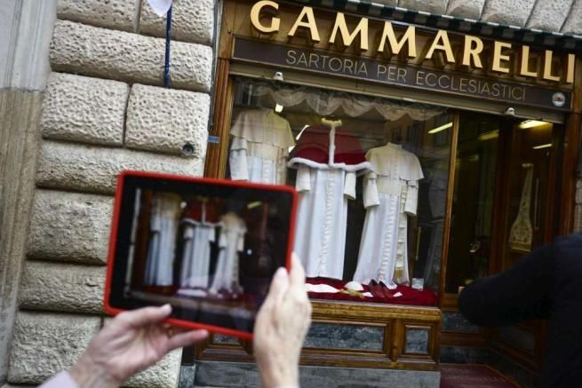 Il vestito del nuovo Papa è pronto ed è esposto, in tre modelli e misure diverse, nella vetrina della sartoria Gammarelli, alle spalle del Pantheon. Sono tre abiti di lana bianca di misura piccola, media e grande visto che non si sa chi sarà il nuovo Pontefice, come ha spiegato uno dei soci della storica sartoria religiosa Lorenzo Gammarelli. In vetrina anche una mozzetta di velluto rosso con bordo di pelliccia bianco, uno zucchetto, una fascia con fiocchi dorati, un cordone e un paio di scarpe di pelle rossa.