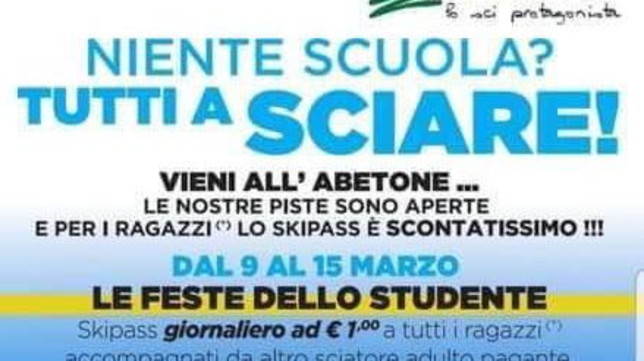 L'invito promozionale agli studenti - "Niente scuola? Venite a sciare". Con questo slogan il comprensorio sciistico dell'Abetone (Pistoia) ha promosso un'iniziativa rivolta agli studenti in questi giorni senza scuola per l'emergenza coronavirus.