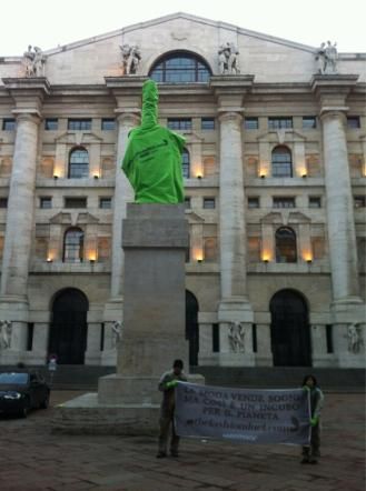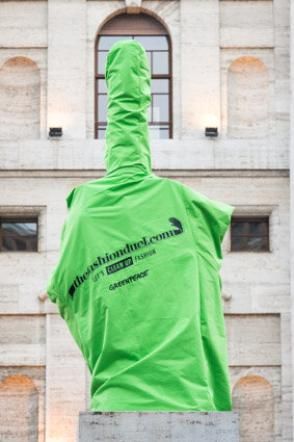 rivolta alla moda. Un guanto verde, simbolo dell'iniziativa, ha rivestito "il Dito", famosa scultura di Maurizio Cattelan. Alla base della scultura � stato srotolato uno striscione con scritto: "La moda vende sogni ma cos� � un incubo per il Pianeta" per chiedere alle aziende che stanno presentando le loro nuove collezioni durante la settimana della moda "di impegnarsi per raggiungere gli obiettivi Deforestazione Zero e Scarichi Zero nella propria produzione".