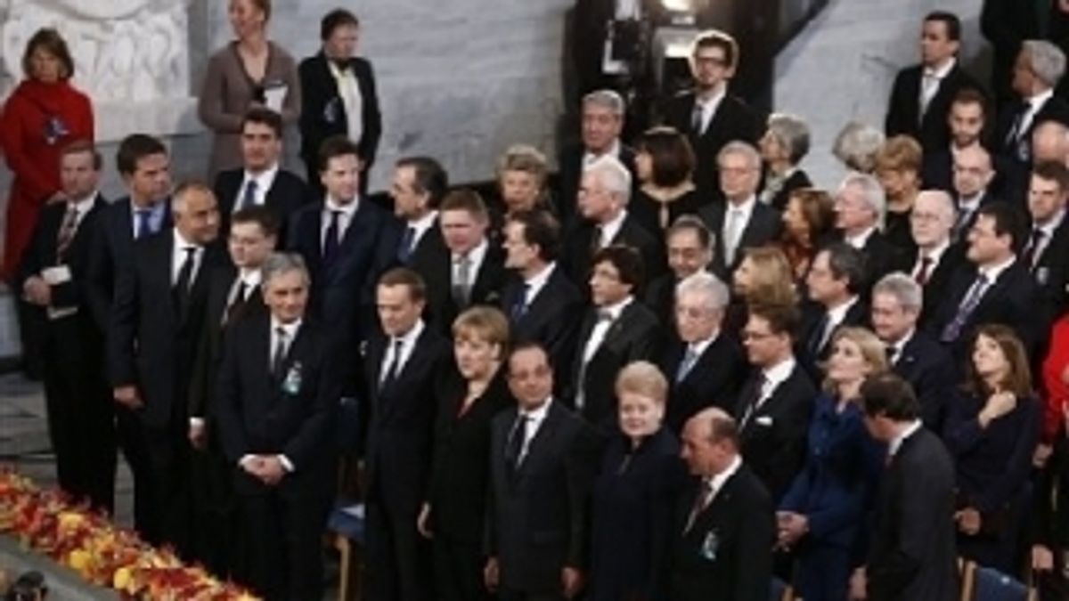 Il premio Nobel per la Pace 2012 assegnato all'Unione Europea è stato consegnato dal presidente del Comitato del Nobel, Thornbjoern Jagland, al presidente del Consiglio Europeo, Herman Van Rompuy, al presidente della commissione Europea, Jose Manuel Barroso, e al presidente del Parlamento Europeo, Martin Schulz. Presente anche il premier Mario Monti. Van Rompuy: "Omaggio a chi ha sognato la pace e l'ha resa realtà".