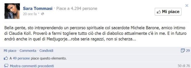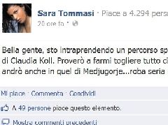 Nuovo colpo di scena nella saga di Sara Tommasi: dopo le foto osé, la guerra alle banche, il film porno, le accuse di essere stata drogata, arriva ora la svolta spirituale. La showgirl sceglie infatti di lanciare dalla sua pagina Facebook la notizia del nuovo cammino intrapreso. "Bella gente, sto intraprendendo un percorso spirituale col sacerdote Michele Barone, amico intimo di Claudia Koll - scrive infatti Sara sul suo profilo Fb -. Proverò a farmi togliere tutto ciò che di diabolico attualmente c'è in me. E in futuro andrò anche in quel di Medjugorje...roba seria ragazzi, non si scherza..."