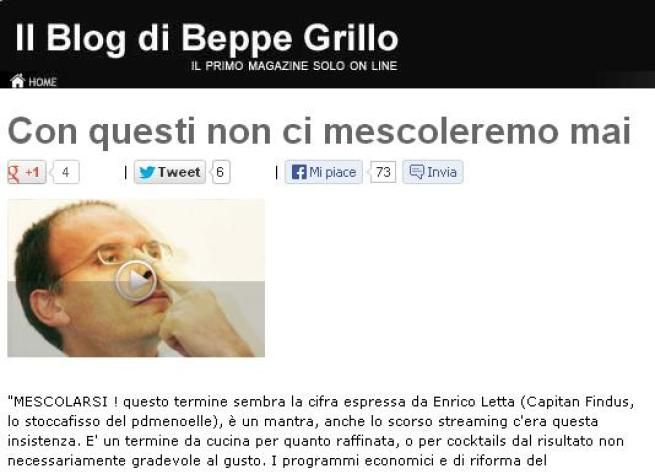 Con questi non ci mescoleremo mai''. E' il titolo di un commento che compare sul blog di Beppe Grillo, che così replica all'invito rivolto dal premier incaricato Enrico Letta ai parlamentari M5S. Il testo, non firmato da Grillo, si conclude con l'affermazione che ''questa casta ha ucciso la democrazia in questo Paese''