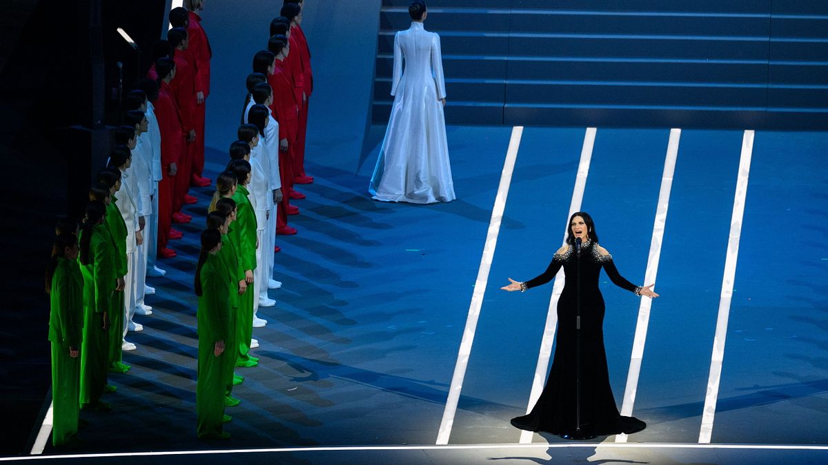 Oltre a Mariah Carey, l'altra grande artista protagonista della serata è Laura Pausini, che intona l'Inno d'Italia, accompagnata a distanza dal coro presente a Cortina. Poi decine di modelle sfilano sul palco al centro dello stadio San Siro, vestite con abiti monocromatici verdi, bianchi e rossi, creati da Giorgio Armani. Un omaggio allo stilista scomparso e alla moda italiana, con la supermodella Vittoria Ceretti che raggiunge il palco protocollare e porge la bandiera italiana al Corpo dei Corazzieri.